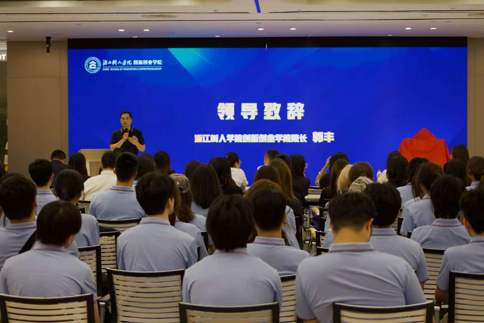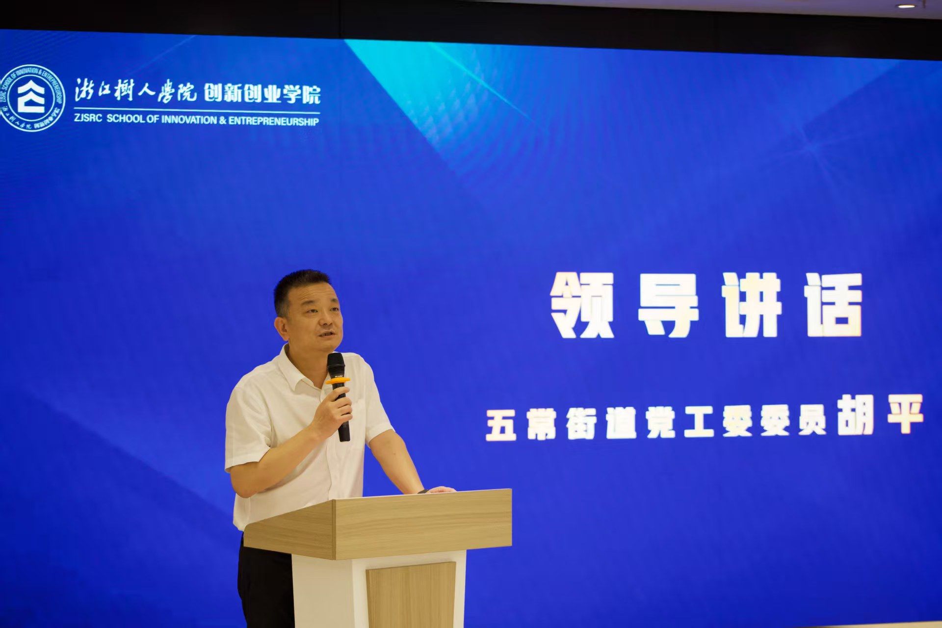 活动伊始,现场播放浙江树人学院宣传片,5分钟的影像浓缩了学校办学发展历程与创新创业教育成果。随后,浙江树人学院创新创业学院院长郭丰致辞。他简要介绍了创新创业人才实验班(青创班)培养体系,凸显学校对于双创人才“能力优先”的培养导向,并表示,“青创班”的创办初心,不是追求让每个学生都成为CEO,而是希望通过项目实践,让大家的抗压能力、人际交往能力以及创新创业内驱力能得到质的提升。同时,他也强调“AI+创新创业”的核心方向,即引导青创学子紧跟产业潮流,将AI技术转化为创新创业的实际动能。接着,五常街道党工委委员胡平讲话,他从区域资源角度出发,介绍了五常街道的发展概况,重点解读了余杭区在引才筑巢方面的扶持政策,强调街道围绕青年人才就业、生活、成长一体化,打造的生产、生活、生态“三生融合”和创新、创业、创投“三创融合”青创友好空间优势,为青创学子“扎根五常、创新创业”提供政策信心。