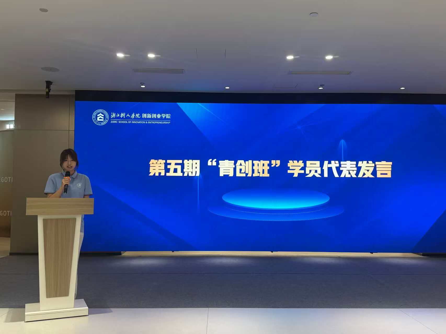 接着,“青创五期”学员代表上台发言。杨汛桥校区班长方冰颖表示:“我们来自全校不同的专业,却有着共同的目标,那就是在创新创业的道路上突破自我,书写壮丽青春答卷!作为班长,我会把服务做到实处,打通沟通衔接的‘最后一公里’;同时用心凝聚团队力量,让团结协作成为我们的‘集体底色’,确保每个人都能在双创项目中发挥所长、发光发热,让团队的每一份努力都掷地有声。”拱宸桥校区班长龚科米则分享了团队荣获浙江省国际大学生创新大赛(2025)金奖的经历,并立下目标:“我会把获得省赛金奖的经验变成全班共享的底气,搭起‘先行者’与‘同路人’的桥梁,让‘团队参赛夺金’升级成为‘班级一起争冠’。”